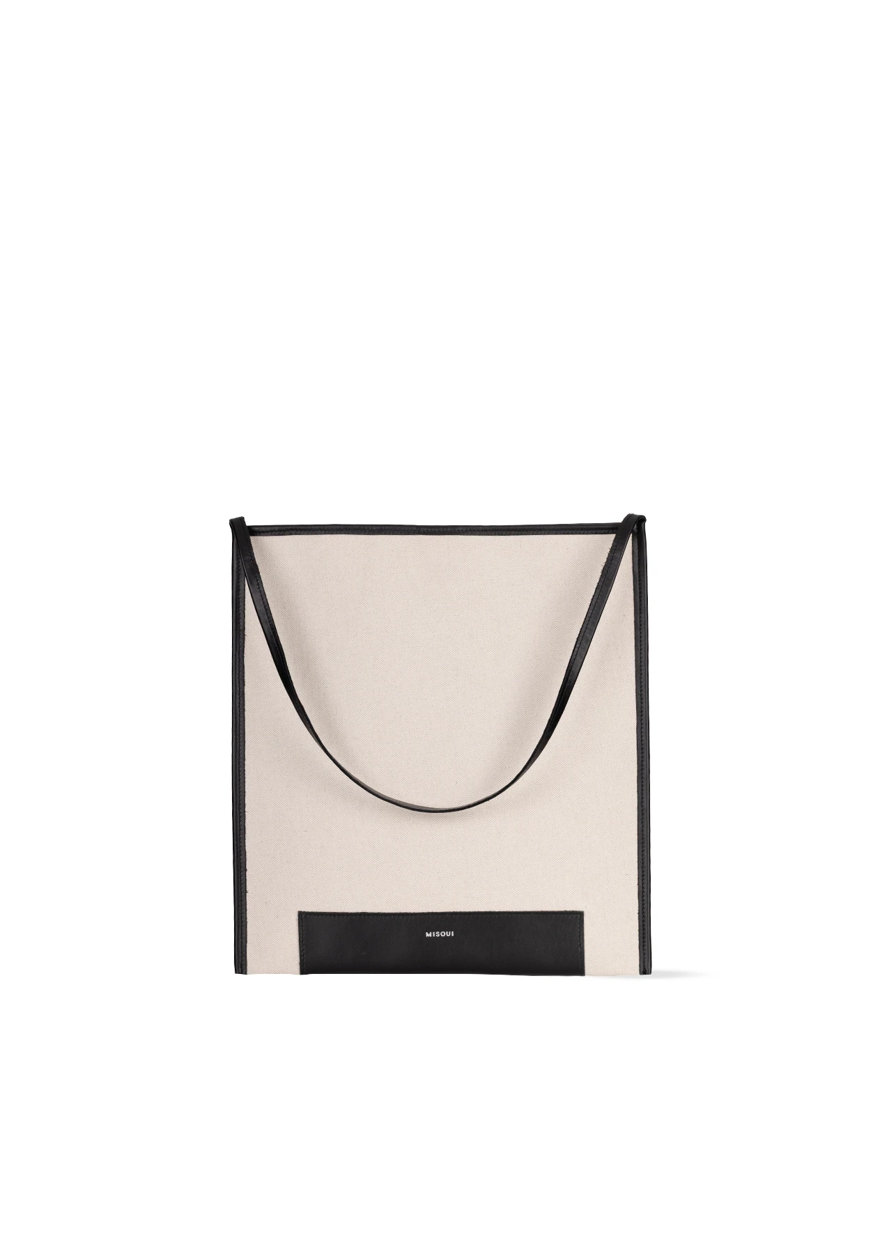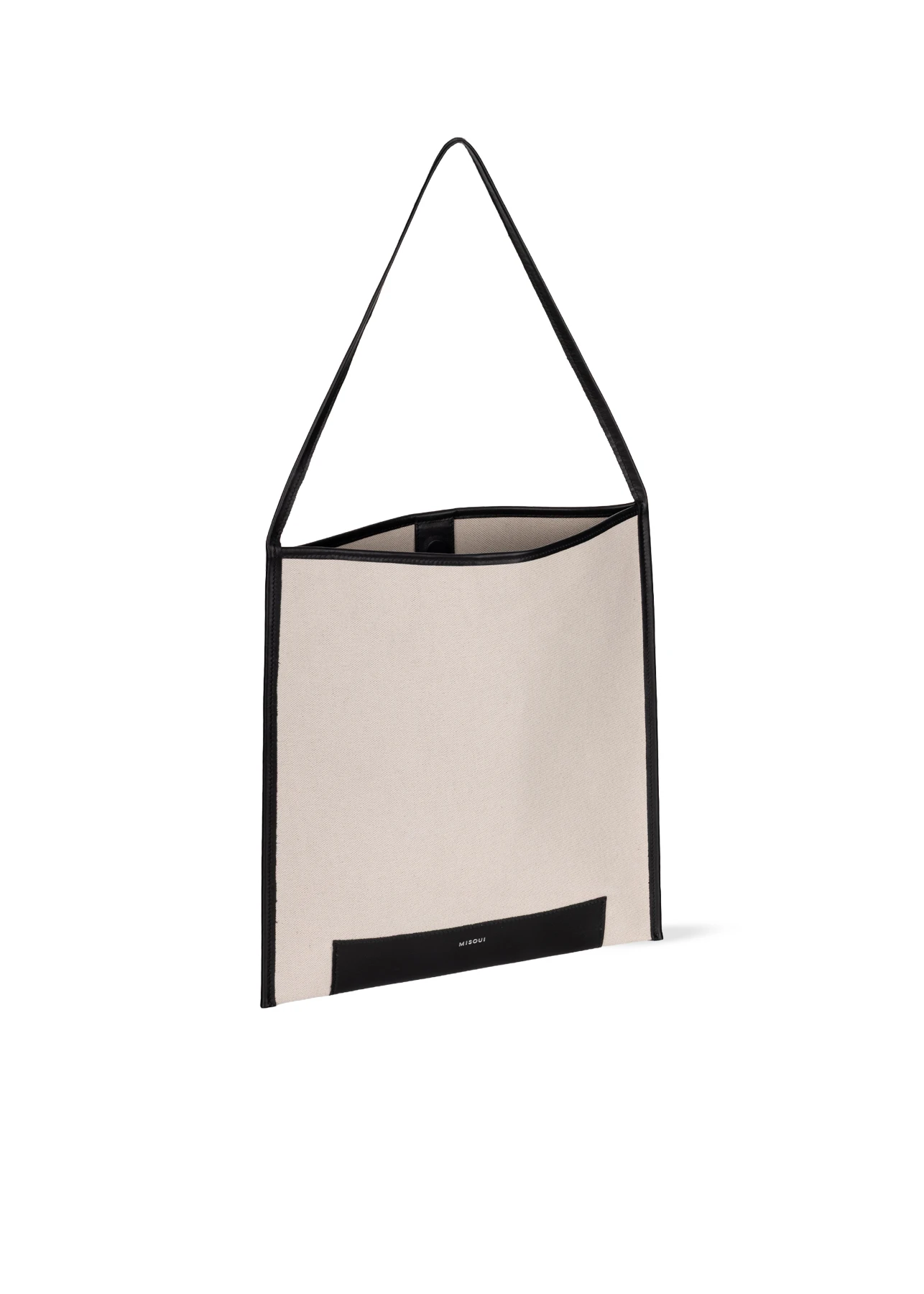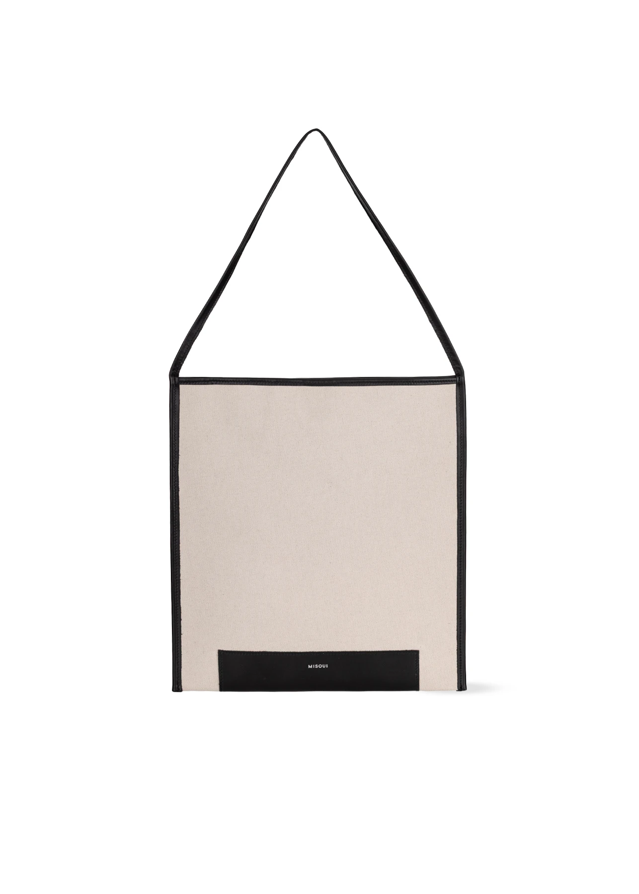 Geometry meets craftsmanship. This minimalist bag, with its striking square shape, is designed for those seeking a ‘quiet luxury’ aesthetic. The combination of raw, light-coloured canvas with deep black leather creates a bold, graphic contrast that will complement any outfit, from an oversized suit to casual denim.